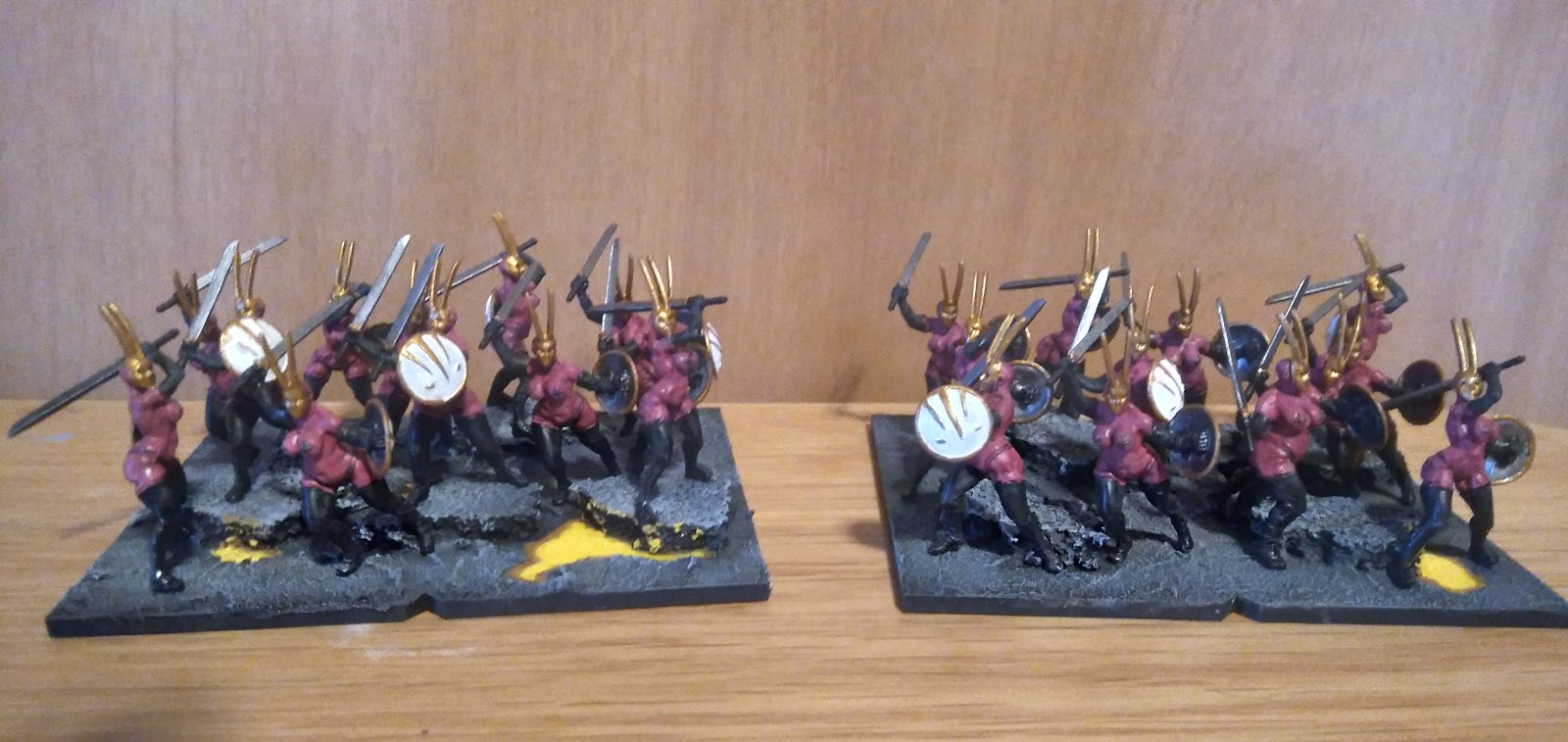 The minis did not come on sprues. I had heard some horror stories about them, like the injection quality being bad with multiple bubbles, or QA being bad with missing or incorrect bits. Thankfully, I had no issues. While prepping, I noticed that there was a bit of a residue on something, but I was not sure if it was the box’s shrinkwrap, the box, the individually-sealed minis or the minis themselves, so I sorted the minis by type so I wouldn't accidentally mix and match pieces (all the nubs were particular..), and gave them a rinse before assembly. The sculpts are pretty distinct, with each coming in four bits. The body (torso and legs), sword arm, shield arm, and mask. This was kind of slick, in that the arm sleeves were the whole bit, so the arm joins were easily disguised. My only complaint is that they went for a nub / peg on the torso to slide into the slim arms, which did not fit well, and split several bits when I didn’t quite orientate it correctly. I think the GW Daemonette approach with flat joins and the possibility to rotate the arms for greater pose variation would have been better? But with some patience, these were easy hurdles and the units were assembled quickly.