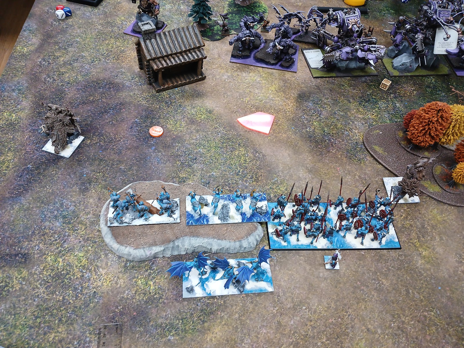I had the slimmest amount of foresight to not put the Spears in the woods. However, I should have pivoted them. The spears are long, and the one horde is able to draw line of sight to them around the forest to the far corner, and given the positioning, will be able to make it in for a flank charge. The other horde goes in as well, but we don’t make it through the combat, as the flanker is able to devastate the Spears with just its attacks.