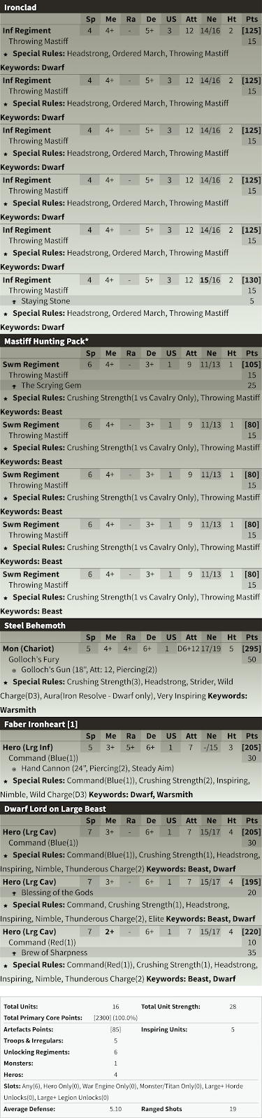 Overall, I did like the concept of the Dwarf list though. We considered dropping the Throwing Mastiffs on the Mastiff Packs and such, so that one is more likely to use them as aggressive chaff, and so we'll see what the future holds for this style!