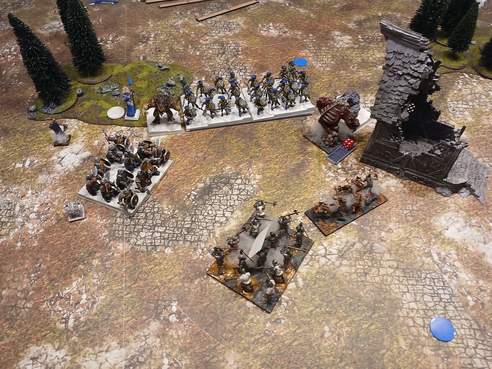On the left we have a Snow Troll Prime, two Hearthguard awkwardly perched on the obstacles with Snow Foxes in tow. Behind the woods hid a second Prime, Dwarfs, and the Cavern Dweller. Peering around the woods were the Naiads and their supporting Ice Queen, with the third Prime holding the Trickster’s Wand securing that flank. I didn’t think much would end up out on the right, and with equal drops, got baited into a very bad match-up, with the Dwarfs showing up very early, and the Ice Blade, Snow Foxes and Frostclaws all as very late drops to reinforce.