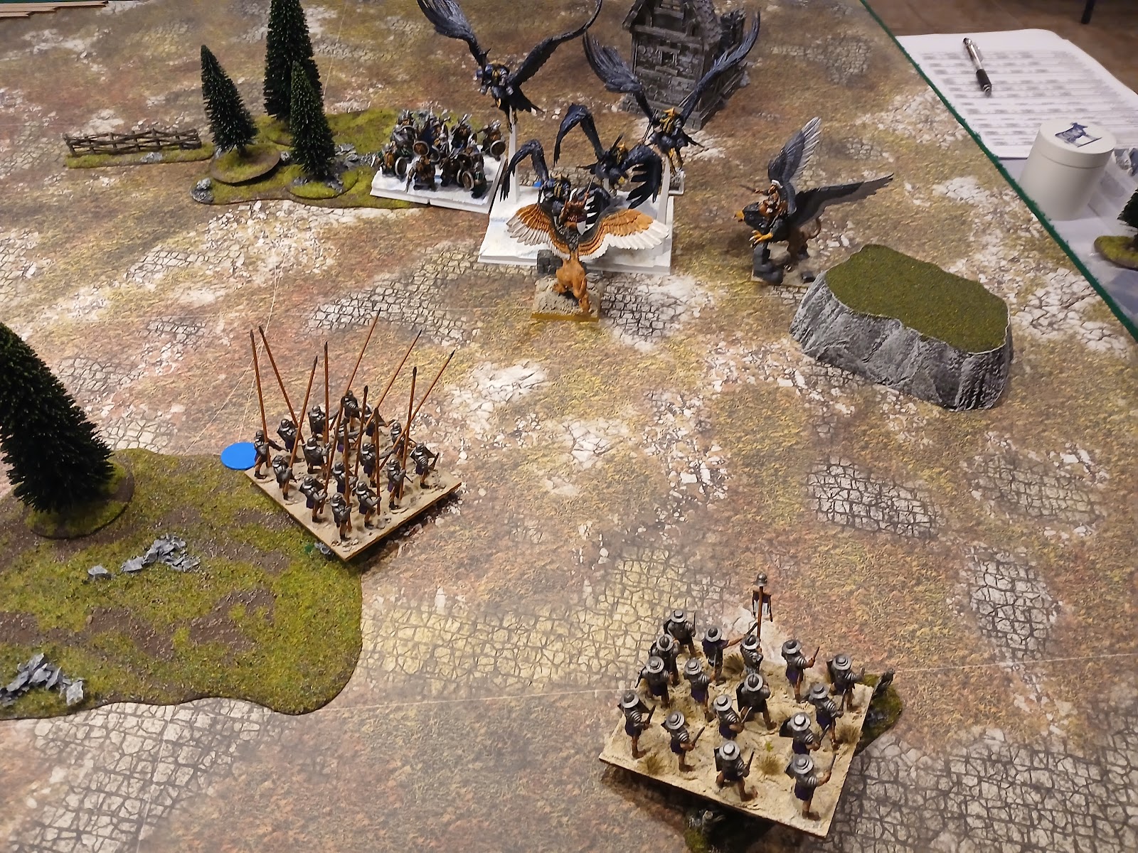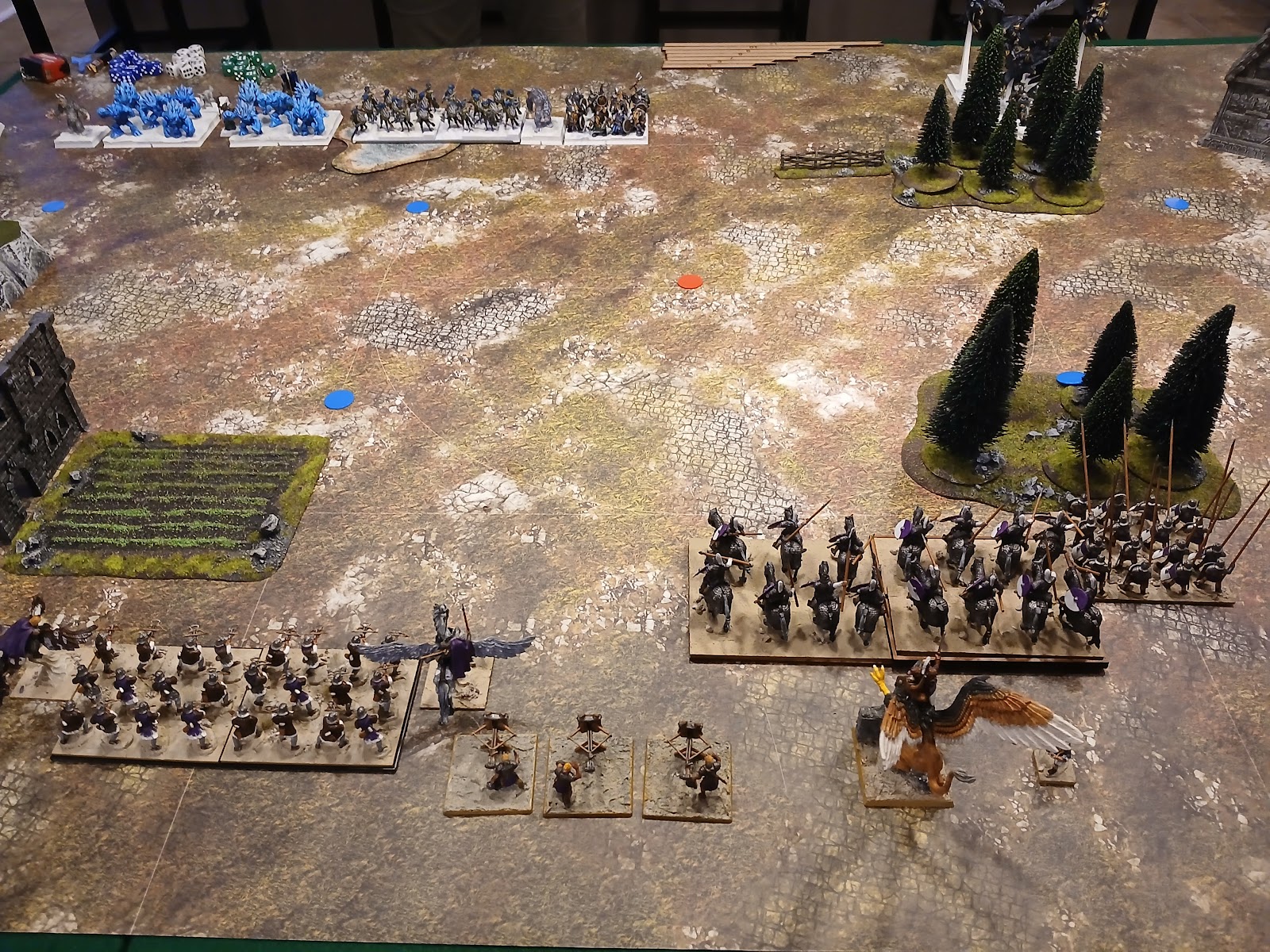 The Naiads were an early drop, so I countered with my Crossbowmen, and set up a strong shooting contingent centrally, since there was a wide field of view. We have a Wizard, Crossbowmen, second Wizard, and all three Ballistae around. We then have the Knight horde pretty centrally, with Pikes ready to claim the woods, and with a second flying General in reserve, along with the Bane Chanting Army Standard Bearer.