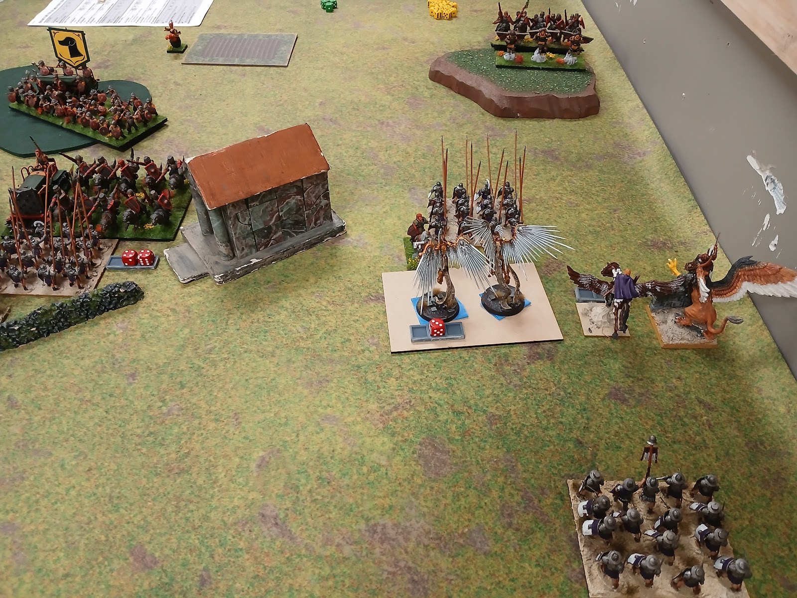 The Muster Captain charges in to disorder the flying Beast Cavalry on the right again, and goes hard, landing 4 damage off 5 attacks, indeed grounding them and stripping them of Thunderous Charge.